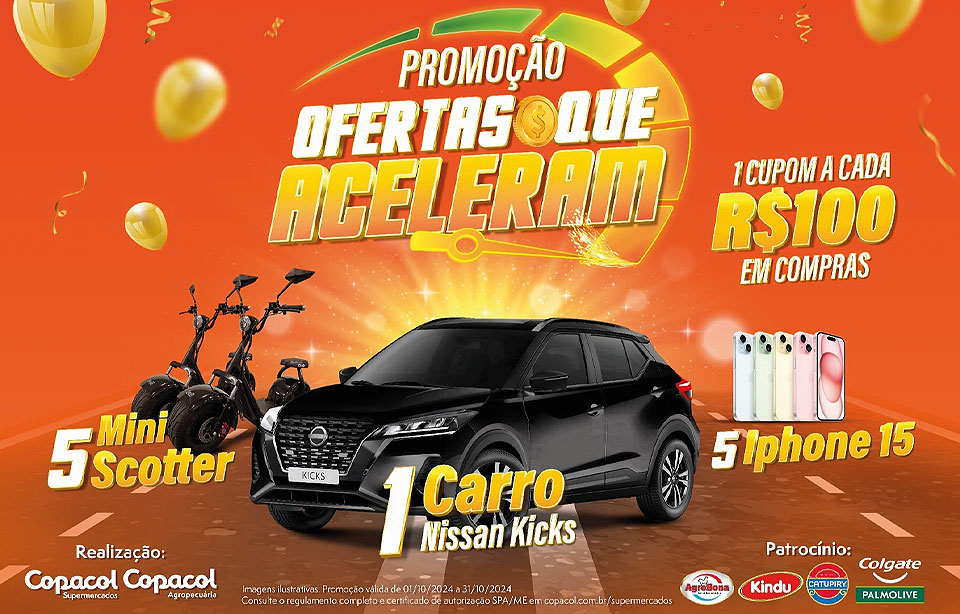 Para comemorar os 61 anos, a Copacol lança a promoção “Ofertas que Aceleram”, que vai sortear Nissan Kicks zero quilômetro, cinco iPhones 15 e cinco veículos Mini Scooters para os consumidores do Copacol Supermercados e Lojas Agro.