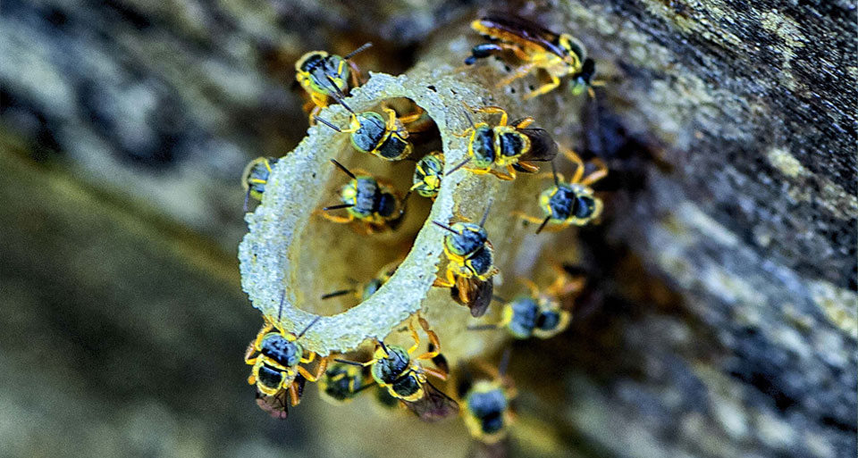 IRAÍ – As iraís são uma espécie tímida e mansa e, assim como as mirins, sem risco ao ser humano. Seu mel é produzido em pequenas quantidades e seus ninhos têm formato característico espiralado. É uma espécie ótima para a meliponicultura.