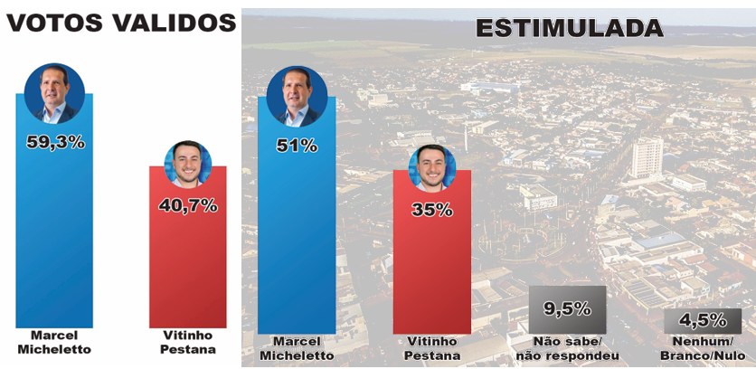 Após uma semana intensa, a corrida eleitoral chega em sua reta final. Amanhã,(DOMINGO, 06/10), o prefeito que governará um dos municípios que mais crescem no Paraná será definitivamente escolhido pelos eleitores. De acordo com a última pesquisa realizada, Marcel Micheletto deverá reassumir o cargo pela terceira vez. Ele aparece com 59,3% dos votos válidos contra 40,7% do seu adversário, Vitinho Pestana. Na pesquisa estimulada, Marcel Micheletto obtém 51% da preferência popular contra 35% de Vitinho Pestana; não sabe/não respondeu 9,5% e brancos/nulos somaram 4,5%.