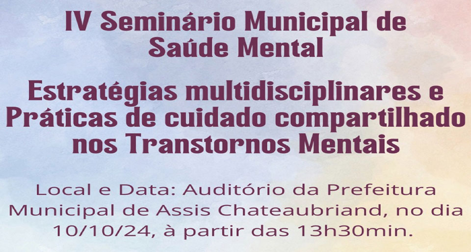 No dia 10 de outubro de 2024, a Secretaria Municipal de Saúde de Assis Chateaubriand, por meio do Centro de Atenção Psicossocial (CAPS) e da EMAESM- Equipes Multiprofissionais em Saúde Mental, realizará o “IV Seminário Municipal de Saúde Mental”. Com o tema “Estratégias Multidisciplinares e Práticas de Cuidados Compartilhados nos Transtornos Mentais”, o evento visa promover o acolhimento e o cuidado a pessoas que enfrentam transtornos mentais ou sofrimento emocional.