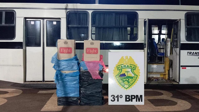 Por volta das 00h30 de ontem (22), durante patrulhamento realizado pela equipe da ROTAM da PMPR, uma equipe visualizou um ônibus diferente dos rotineiros estacionado próximo à rodoviária de Jesuítas, sendo que ao se aproximar do mesmo, foi possível visualizar e constatar estar carregado com diversas caixas de cigarro oriundas do Paraguai.