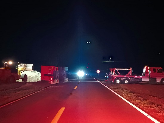 O acidente foi registrado por volta das 21h20 de ontem (25), na rodovia PR 581, trecho que liga PR 239, entre Assis Chateaubriand a Toledo, sentido Tupãssi, sendo o tombamento de uma carreta trator, Scania/T112 HS, emplacado em Tupãssi, conduzido por um homem de 41 anos, que sofreu ferimentos leves.