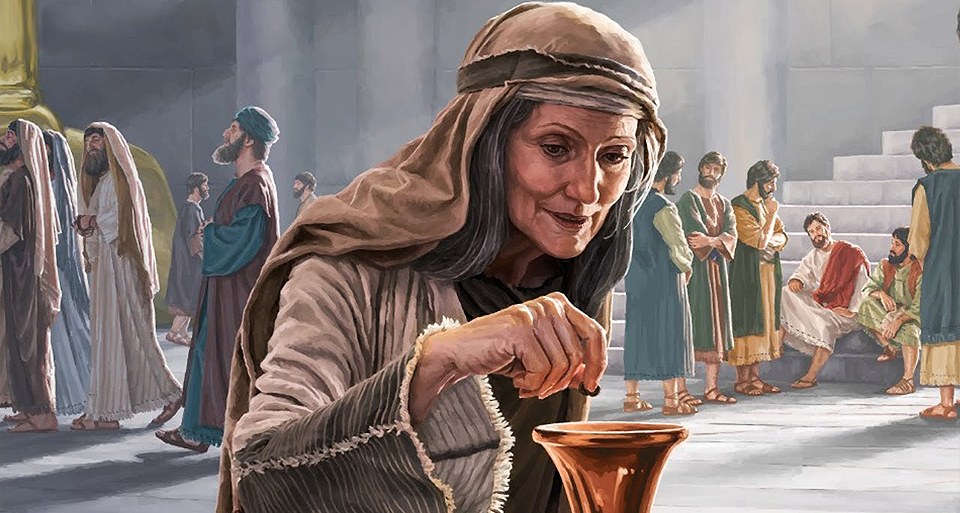 Jesus ensina seus discípulos e cada um de nós a não imitar este tipo de comportamento, pois o serviço generoso é a marca do verdadeiro discípulo de Jesus. Em seguida, Jesus, sentado junto ao cofre do templo, observa as pessoas que lá vão depositar sua oferta. Chama a sua atenção uma mulher, pobre e viúva, que deposita apenas algumas moedinhas. Este fato o comove e ele chama a atenção dos seus discípulos para ensinar que o exemplo dela deve ser seguido. Todos ofertavam o que sobrava e que não lhes faria falta, a pobre viúva, porém, ofertava a Deus tudo o que tinha, colocando em risco a própria vida.