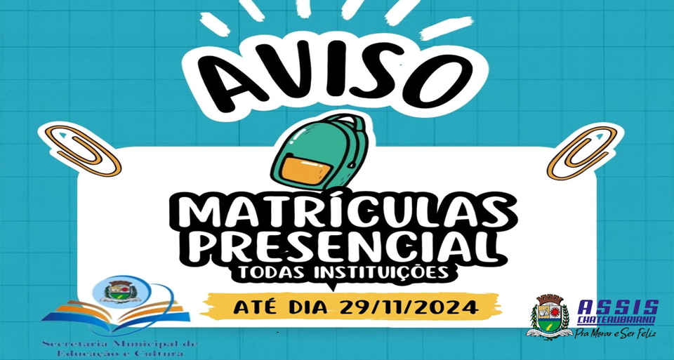 A prefeitura Municipal de Assis Chateaubriand, por meio da Secretaria de Educação e Cultura, informa que as matrículas para o ano letivo de 2025 deverão ser realizadas presencialmente em todas as instituições de ensino do município. Mesmo nas quatro instituições que permitiram rematrículas online para os alunos já matriculados, é indispensável a presença dos pais e/ou responsáveis para a efetivação do processo.
