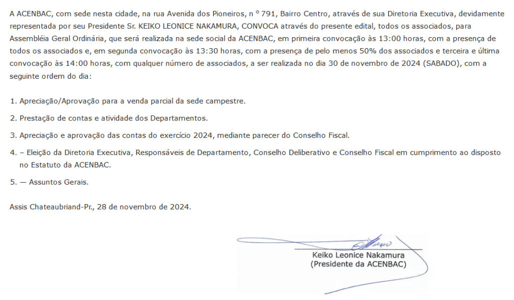 Edital de convocação para assembléia geral ordinária para eleição da diretoria da ACENBAC