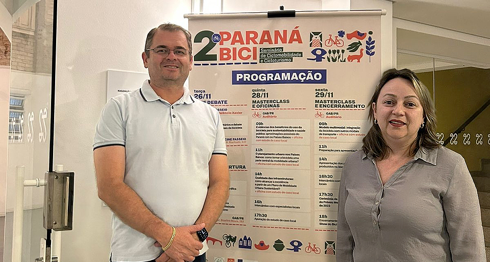 O vice-prefeito licenciado e superintendente de Administração e Finanças, Cloves Angeleli e a secretária do Trabalho, Emprego e Turismo, Milene Angeleli, participam em Curitiba, do 2º Seminário Paranaense de Ciclomobilidade e Cicloturismo – Paraná Bici.