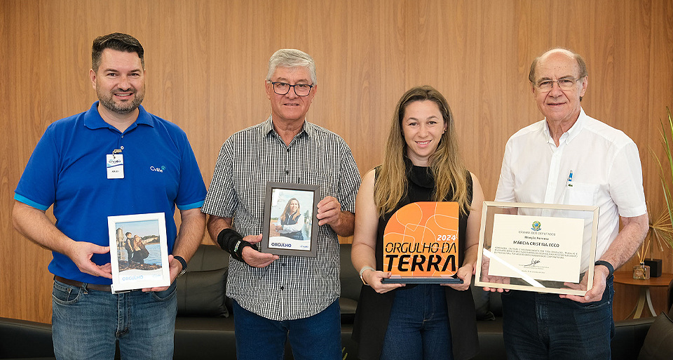 A associada da C.Vale, Márcia Cristina Ecco, foi premiada na categoria “Piscicultura” pelo Prêmio Orgulho da Terra 2024 da RIC TV Record. A produtora de tilápia também foi reconhecida pela Câmara dos Deputados como uma das melhores piscicultoras do Brasil. O presidente da C.Vale, Alfredo Lang, fez a entrega das honrarias, no dia 26 de novembro. Ao entregar o troféu e a menção honrosa à produtora, ele disse que a integrada é um exemplo a ser seguido. “A associada é um real exemplo da dedicação e seriedade com que os nossos produtores trabalham para levar alimento seguro e de qualidade para a mesa do consumidor.”