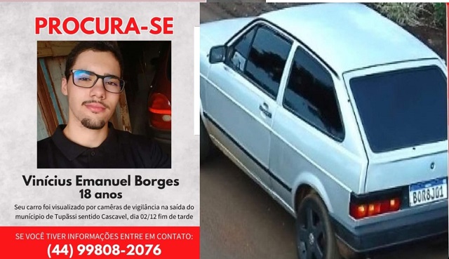 Familiares de Vinicius Emanuel Borges de 18 anos de idade, procuraram a reportagem do Portal Policial Web, para relatar o desaparecimento do Jovem, que desde a última segunda-feira (02), saiu do serviço e não retornou para casa, sendo que o mesmo estava em seu veículo, um VW Gol, modelo quadrado, placas BOR 8J01, Mercosul.