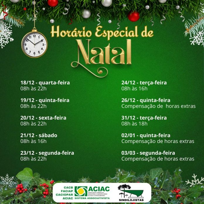 O comércio de Assis Chateaubriand terá horário especial de atendimento de 18 a 23 de dezembro das 8h às 22h. No sábado, dia 21 de dezembro, das 8h às 16h. Já na véspera de Natal, dia 24 de dezembro, das 8h às 16h. O intervalo para almoço será de duas horas e intervalo para lanche noturno vai ser de 30 minutos. O valor do lanche será de R$ 50. As compensações de horas extras serão nos dias: 26/12/2024, 02/01/2025 e 03/03/2025.
