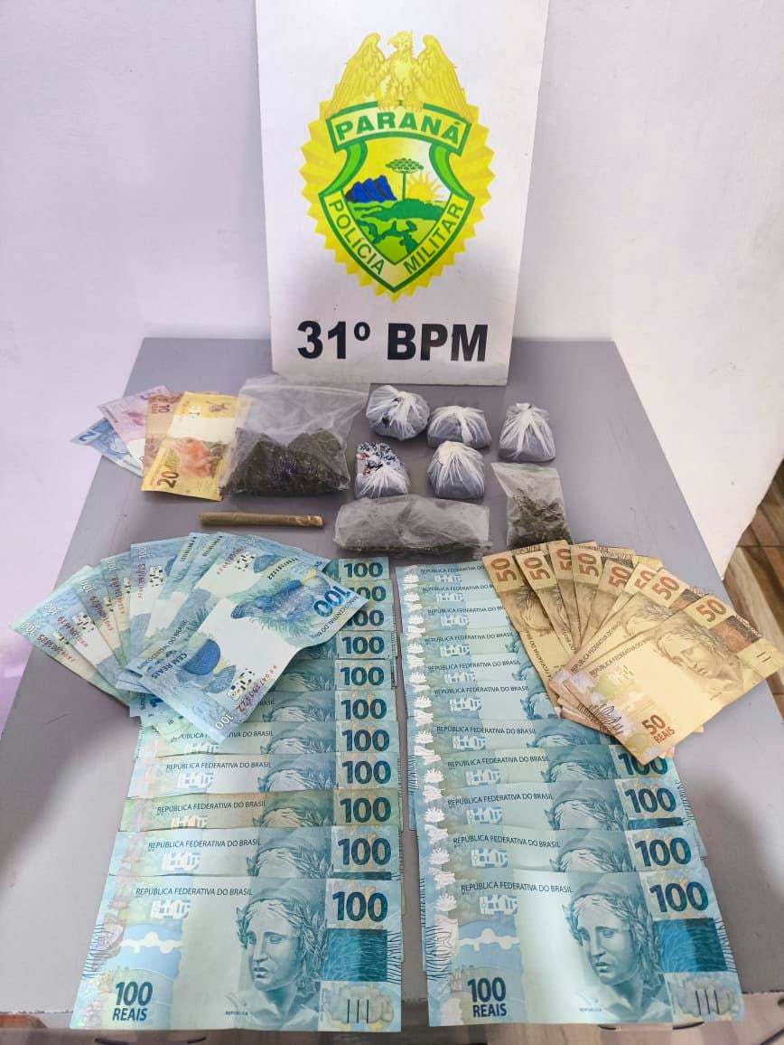 Em razão da presença do cigarro de maconha no veículo e do forte odor de substância entorpecente, foi realizada busca no interior do automóvel. Durante a busca foi encontrada uma bolsinha contendo diversos pacotes de substância análoga à maconha. Após pesagem, obteve-se um total de 197g (compostas por 13 porções e um cigarro de maconha). Além disso foram localizados R$ 3.537,00 (três mil quinhentos e trinta e sete reais), um celular Iphone XR e um celular Redmi Note 8. Em consulta à placa do veículo foi verificado que o licenciamento estava regular, sem débitos.