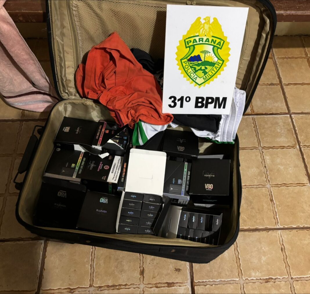 Equipe Patrulha Rural, realizou a abordagem de um ônibus linha Foz do Iguaçu x São Paulo, sendo em verificação foram localizadas uma bolsa contendo em seu interior diversos cigarros eletrônicos, sendo identificado que as bolsas pertenciam a um homem a qual a informou que levaria até a cidade de Maringá. Foi qualificado o dono e apreendida a mercadoria e encaminhado a receita federal de Cascavel.