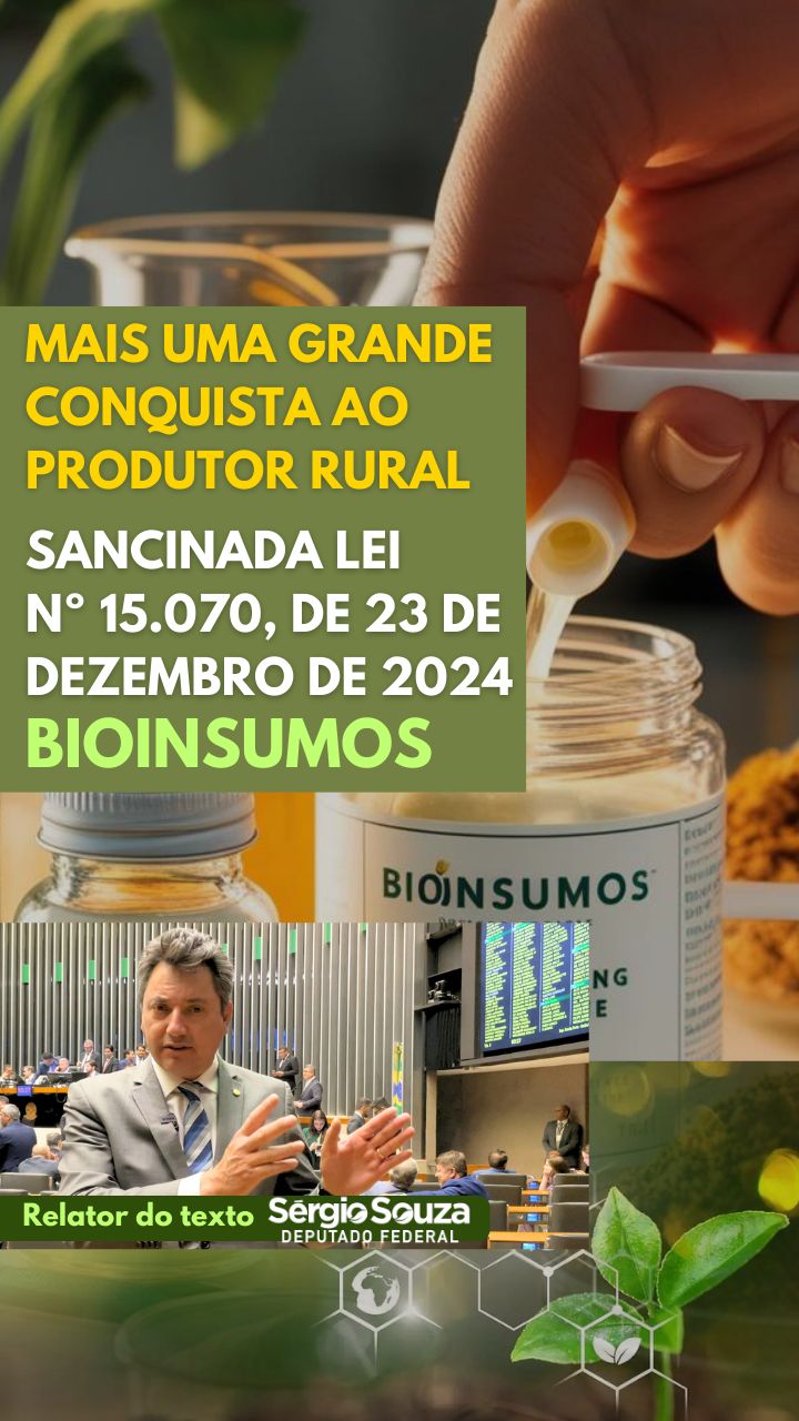 Foi sancionada uma importante legislação que representa um avanço significativo para o setor agropecuário brasileiro. A Lei Nº 15.070, de 23 de dezembro de 2024, fruto de um trabalho minucioso e dedicado do relator deputado Sergio Souza (MDB-PR), estabelece diretrizes claras para a produção, importação, exportação, registro, comercialização, uso, inspeção, fiscalização, pesquisa, experimentação, embalagem, rotulagem, propaganda, transporte, armazenamento, taxas, prestação de serviços, destinação de resíduos e embalagens e incentivos à produção de bioinsumos.