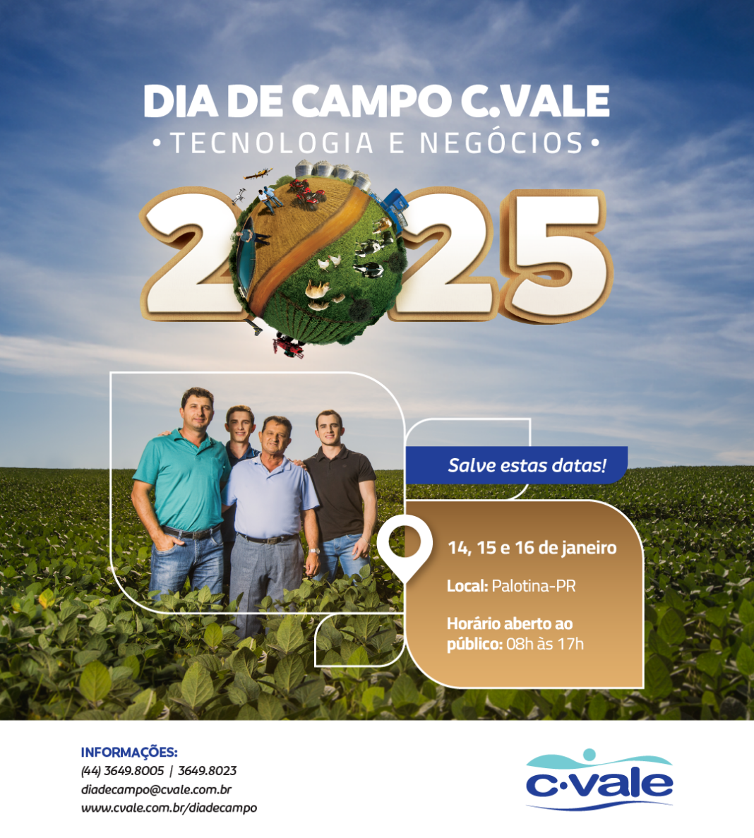 A terceira edição do Dia de Campo de Verão da C. Vale, de 14 a 16 de janeiro de 2025, na nova área de pesquisas da cooperativa, terá a participação de 135 empresas das áreas de grãos, mandioca, insumos, pecuária, máquinas, implementos, suinocultura, avicultura e piscicultura. Neste último segmento, a C. Vale vai mostrar uma nova tecnologia para a criação de tilápias em um tanque construído especialmente para o evento.