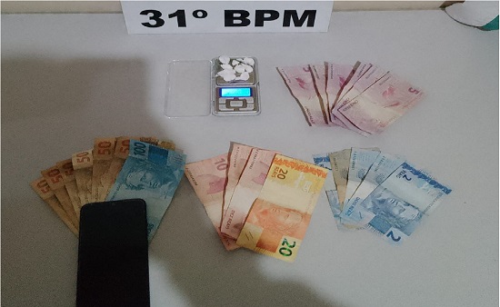 Feita abordagem, durante busca pessoal foi localizado 9 buchas, totalizando 3 gramas de substância análoga a cocaína e R$ 490,00 em espécie.