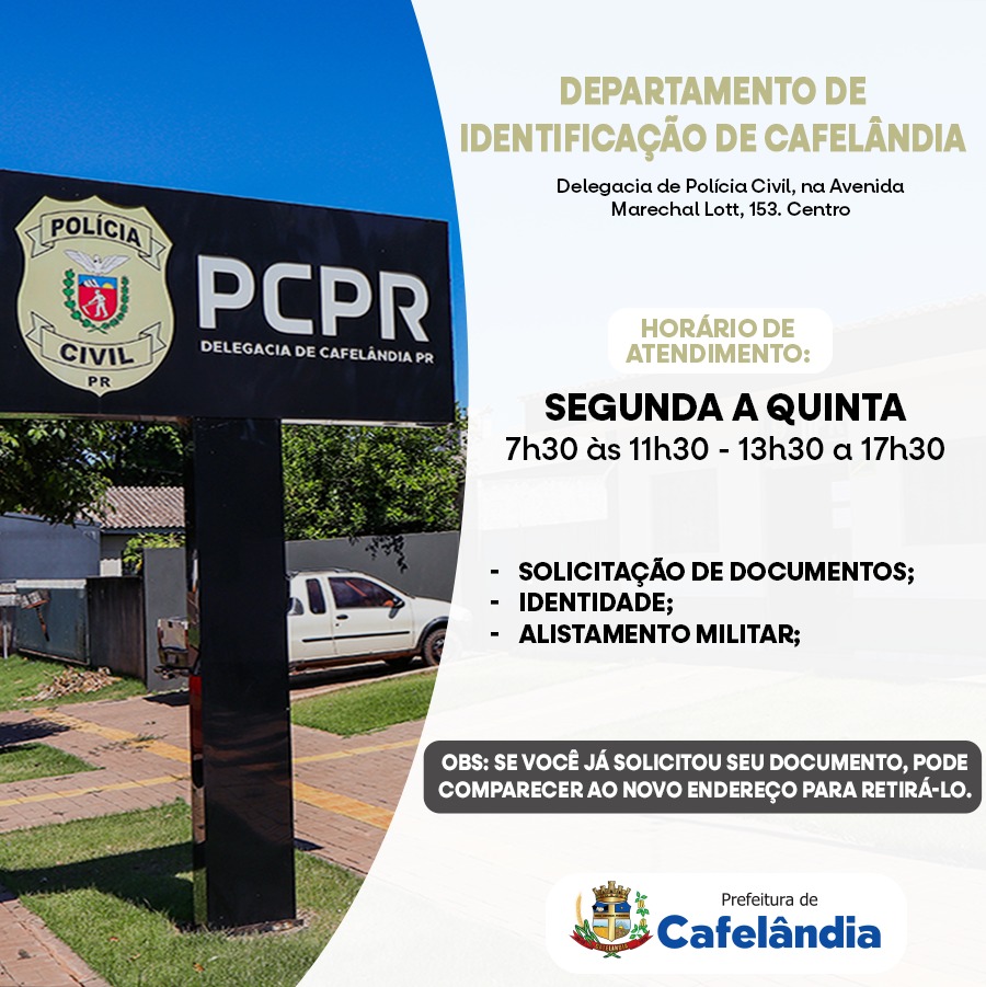 📅 Horário de atendimento é de Segunda a Quinta dás 7h30 às 11h30 e 13h30 às 17h30. O Departamento de Identificação é realizado serviços essenciais, como a emissão de documentos de identidade, alistamento militar, entre outros documentos necessários;^📌 importante: Se você já solicitou um documento, pode comparecer ao novo endereço para retirá-lo. Evite deixar para a última hora!