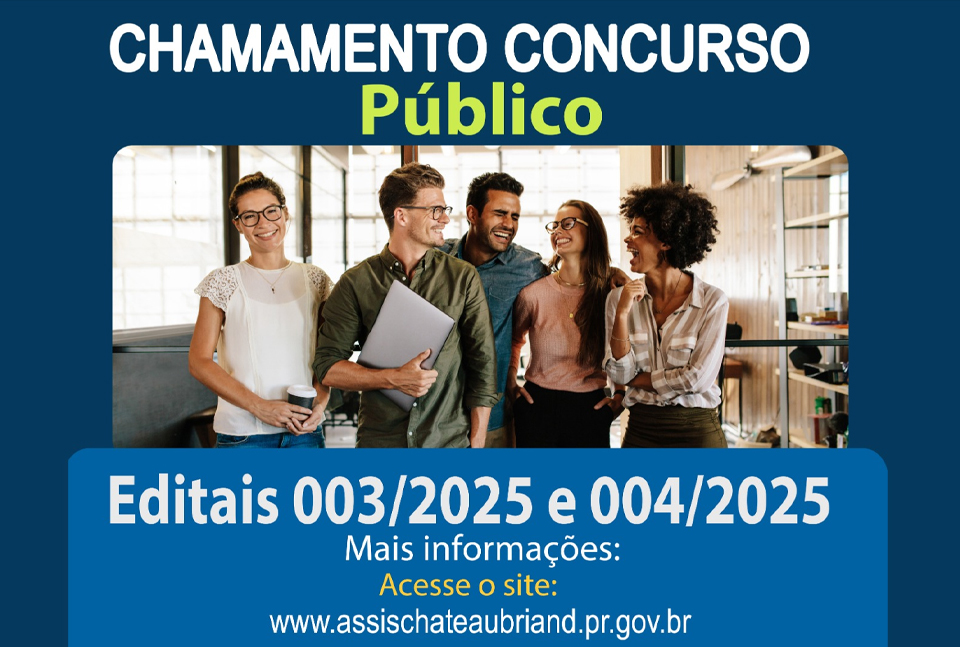 Publicado nesta sexta-feira (24), em diário oficial do município de Assis Chateaubriand, os editais 003/2025, tratando-se da centésima quadragésima quarta convocação de candidato habilitado no concurso público 01/2019, visando à nomeação no cargo de Professor de Educação Infantil, Agente Administrativo II, Agente de Endemias e Enfermeiro Padrão I. E o edital 004/2025, tratando-se da décima segunda convocação de candidato habilitado no concurso público 01/2024, visando à nomeação no cargo de professor.