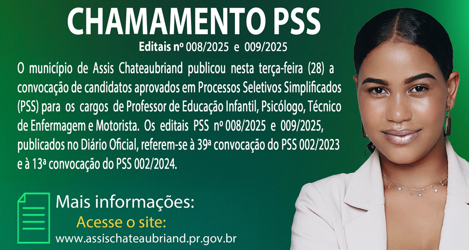 O município de Assis Chateaubriand publicou nesta terça-feira (28) a convocação de candidatos aprovados em Processos Seletivos Simplificados (PSS) para os cargos de Professor de Educação Infantil, Psicólogo, Técnico de Enfermagem e Motorista PSS. Os editais PSS nº 008/2025 e 009/2025, publicados no diário oficial, referem-se à 39ª convocação do PSS 002/2023 e à 13ª convocação do PSS 02/2024.