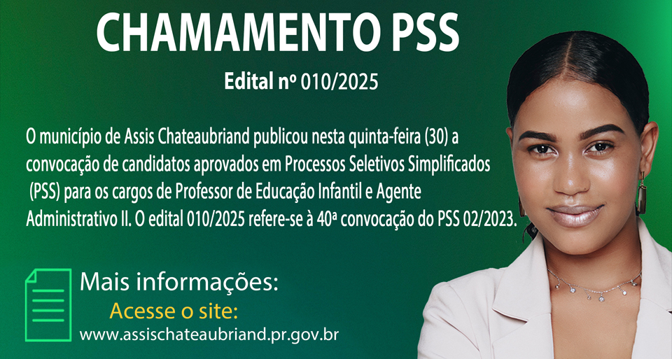 O município de Assis Chateaubriand publicou nesta quinta-feira (30) a convocação de candidatos aprovados em Processos Seletivos Simplificados (PSS) para os cargos de Professor de Educação Infantil e Agente Administrativo II. O edital 010/2025 refere-se à 40ª convocação do PSS 02/2023.