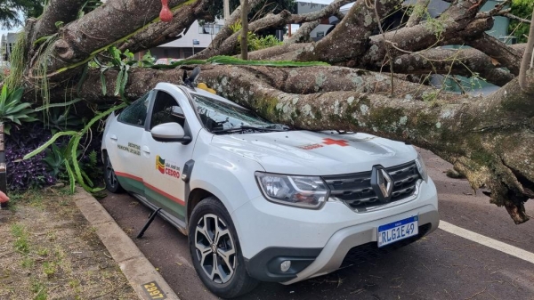Um veículo da Secretaria de Saúde de São José do Cedro-SC, foi esmagado por uma árvore na manhã desta quinta-feira (30), na rua Santa Catarina, no Centro de Cascavel. A árvore de médio porte, que fica localizada ao lado do Teatro Municipal, acabou cedendo e caindo sobre o Renault Duster que estava estacionado em via pública. O condutor do carro estava descansando dentro do veículo quando a árvore caiu. Apesar do susto, felizmente ele não se feriu.