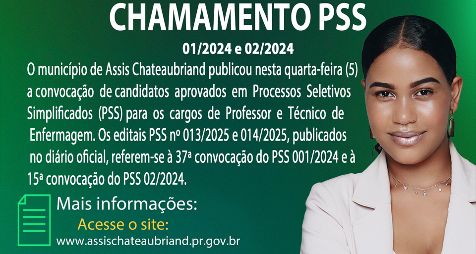 O município de Assis Chateaubriand publicou nesta quarta-feira (5) a convocação de candidatos aprovados em Processos Seletivos Simplificados (PSS) para os cargos de Professor e Técnico de Enfermagem. Os editais PSS nº 013/2025 e 014/2025, publicados no diário oficial, referem-se à 37ª convocação do PSS 001/2024 e à 15ª convocação do PSS 02/2024.