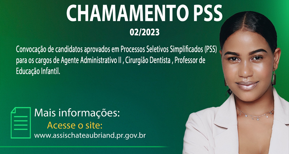 O município de Assis Chateaubriand publicou nesta sexta-feira (7) a convocação de candidatos aprovados em Processos Seletivos Simplificados (PSS) para os cargos de Agente Administrativo II , Cirurgião Dentista , Professor de Educação Infantil. O edital PSS nº 016/2025, publicado no diário oficial, refere-se à 42ª convocação do PSS 002/2023.