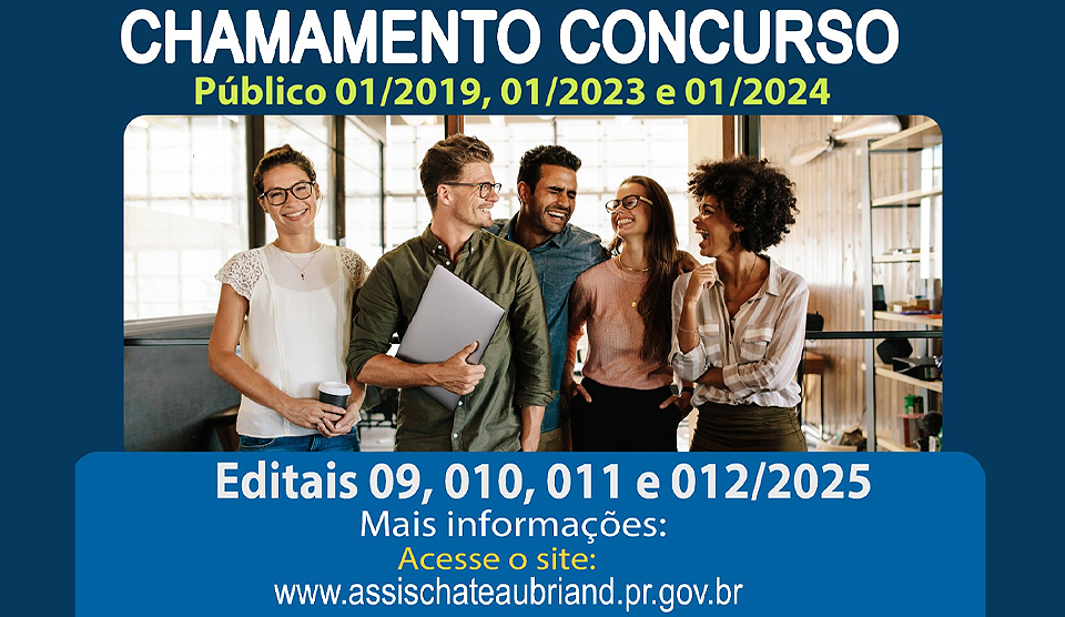 Publicado nesta sexta-feira (7), em diário oficial do município de Assis Chateaubriand, os editais 009/2025, tratando-se da centésima quadragésima sétima convocação de candidato habilitado no concurso público 01/2019, visando à nomeação no cargo de Agente Administrativo II, Agente de Endemias, Médico Veterinário I, Psicólogo II e Professor de Educação Infantil. O edital 010/2025, tratando-se da trigésima nona convocação de candidato habilitado no concurso público 01/2023, visando à nomeação no cargo de Agente Comunitário de Saúde, Assistente Social, Borracheiro, Educador Social e Servente Cozinheira. O edital 011/2025, tratando-se da décima quarta convocação de candidato habilitado no concurso público 01/2024, visando nomeação no cargo de professor. E ainda o edital 012/2025, tratando-se da centésima quadragésima oitava convocação de candidato habilitado no concurso público 01/2019, visando à nomeação no cargo de Enfermeiro Padrão I.