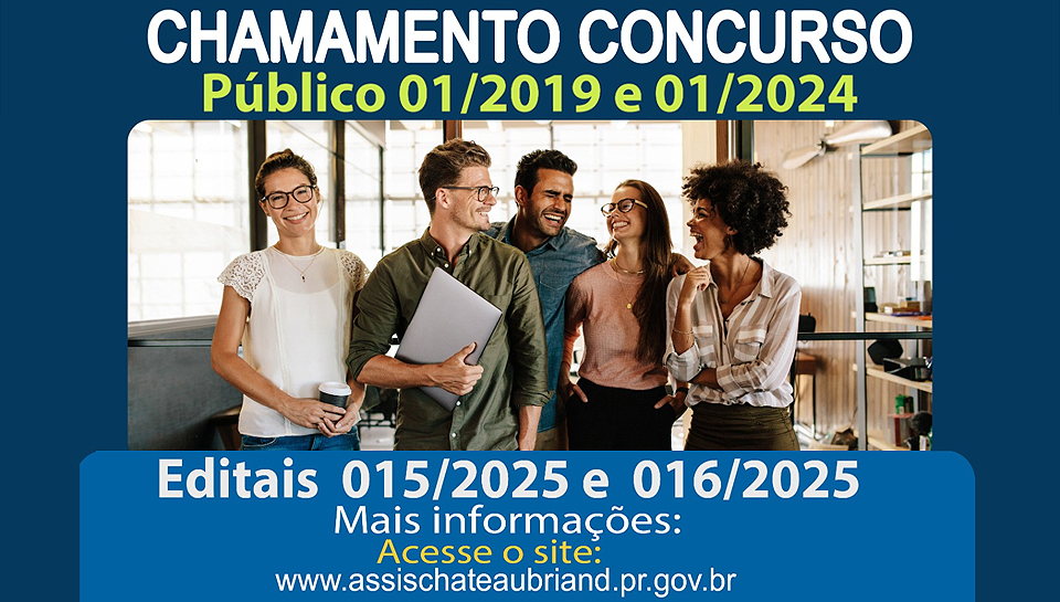 Publicado nesta quarta-feira (12), em diário oficial do município de Assis Chateaubriand, os editais 015/2025, tratando-se da centésima quinquagésima primeira convocação de candidato habilitado no concurso público 01/2019, visando à nomeação no cargo de Agente Administrativo II e Professor de Educação Infantil. E ainda o edital 016/2025, tratando-se da decima quinta convocação de candidato habilitado no concurso público 01/2024, visando à nomeação no cargo de Professor.