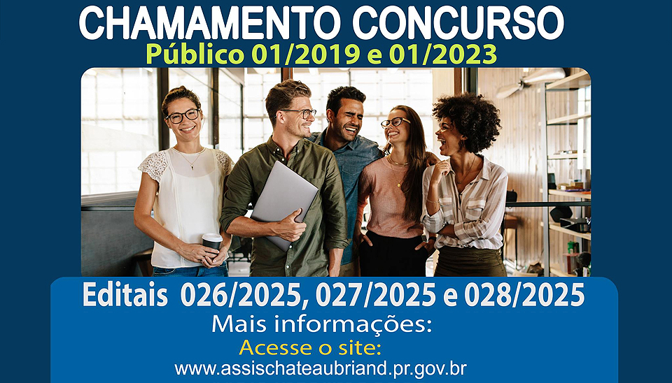 Publicado nesta quarta-feira (26), em diário oficial do município de Assis Chateaubriand, os editais 026/2025, tratando-se da centésima quinquagésima sétima convocação de candidato habilitado no concurso público 01/2019, visando à nomeação no cargo Agente Administrativo II. O edital 027/2025, tratando-se da quadragésima segunda convocação de candidato habilitado no concurso público 01/2023, visando à nomeação no cargo de Assistente Social, Farmacêutico. E ainda o edital 028/2025 tratando-se da centésima quinquagésima oitava convocação de candidato habilitado no concurso público 01/2024, visando à nomeação no cargo de médico Clínico Geral.