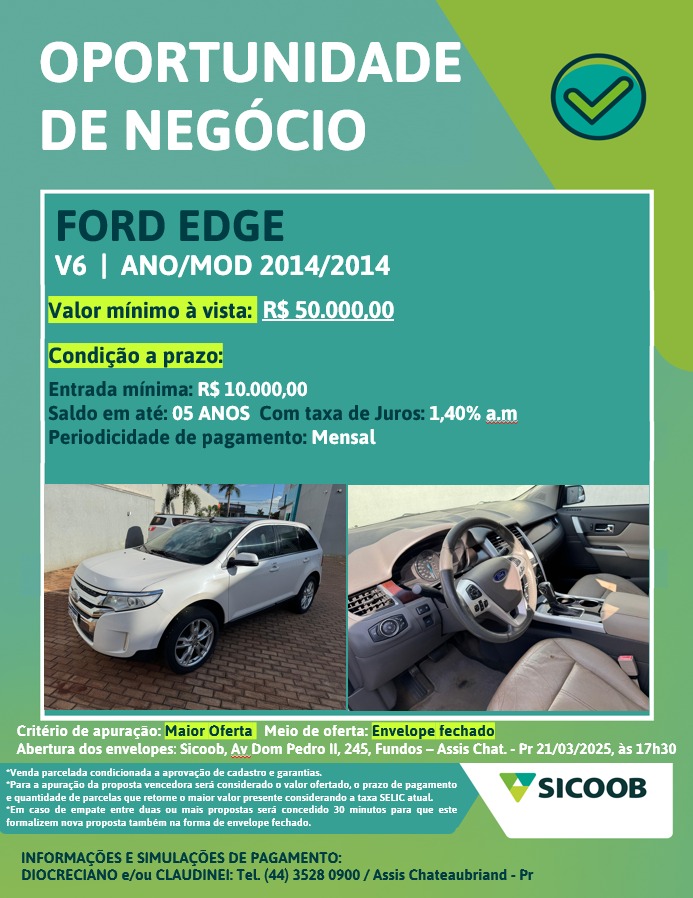 Assis ChateaubriandOportunidade de Negócio Sicoob: Ford Edge 2014/2014Por Criador do Regional O Regional241março 20, 2025 Oportunidade de Negócio Sicoob:FORD EDGE 2014/2014 – R$50 MIL À VISTA. OU A PRAZO COM R$10 MIL DE ENTRADA, SALDO EM ATÉ 5 ANOS, TAXA DE JUROS DE 1,40% A.M COM PARCELAS MENSAIS. MAIS DETALHES NO ANÚNCIO. CONFIRA:Compartilhe isso: Compartilhar no Facebook(abre em nova janela) Facebook Compartilhar no X(abre em nova janela) 18+ Curtir isso:Curtir Carregando...CompartilhadoFacebookWhatsApp Artigo anteriorExportação de carne brasileira navegará entre desafios e oportunidades em 2025Próximo artigoSicoob Médio Oeste: Nova Aurora reúne ótimo público e apresenta números expressivosÚltimas notícias UncategorizedIracema do Oeste comemora o Dia Internacional da Mulher Redação - março 6, 2026 UncategorizedInscrições abertas para Eleição Suplementar do Conselho Tutelar – Gestão 2024-2027 Redação - março 6, 2026 UncategorizedEducação de Iracema do Oeste recebe novas profissionais Jesuitas Publicidade LegalPortaria n.º 077 2026 – Diarias 019 edicarlos- Anúncio -Assis ChateaubriandPolícia Militar apreende revólver calibre .38 durante abordagem em Assis Chateaubriand março 2, 2026 Audiência Pública: Transparência e Cumprimento das Metas Fiscais e Sociais em Assis Chateaubriand fevereiro 28, 2026 Assis Chateaubriand conquista o Programa Bons Olhos fevereiro 28, 2026 Audiência Pública discute Expansão do Perímetro Urbano em Assis Chateaubriand fevereiro 28, 2026 Mais de R$ 294 mil para a cultura em Assis Chateaubriand fevereiro 28, 2026