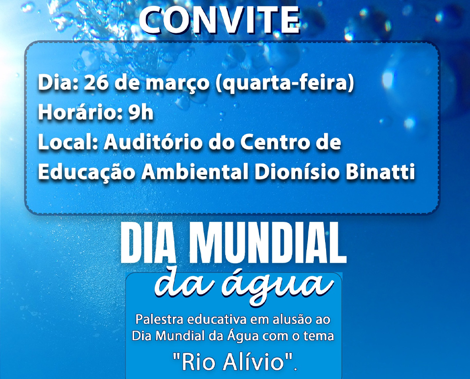 A Prefeitura de Assis Chateaubriand, por meio da Secretaria de Serviços Urbanos e Meio Ambiente, realizará no dia 26 de março, às 9h, uma palestra educativa no Auditório do Centro de Educação Ambiental Dionísio Binatti. O evento terá como tema “Rio Alívio” e será conduzido por representantes da Sanepar, com foco em sensibilização ambiental. A Palestra educativa será em alusão ao Dia Mundial da Água.