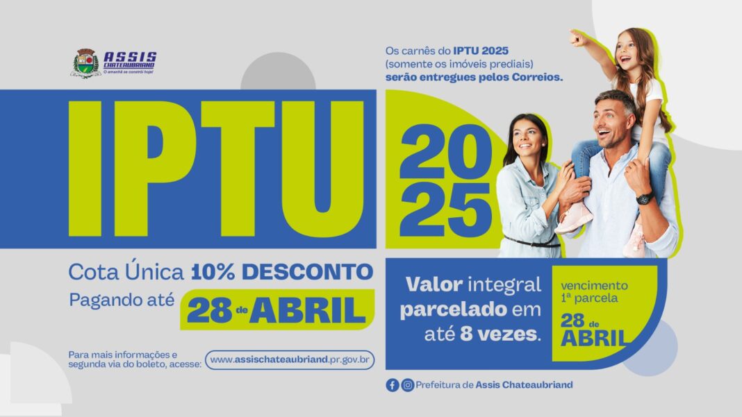 A Prefeitura de Assis Chateaubriand informa que os carnês prediais do IPTU 2025, serão entregues pelos Correios. Os contribuintes que optarem pelo pagamento em cota única terão direito a um desconto de 10%, desde que o pagamento seja efetuado até o dia 28 de abril de 2025. Para quem preferir parcelar, o imposto poderá ser dividido em até oito vezes.