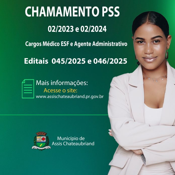 O município de Assis Chateaubriand publicou nesta quinta-feira (3) a convocação de candidatos aprovados em Processos Seletivos Simplificados (PSS) para os cargos de Médico ESF e Agente Administrativo. Os editais PSS nº 045/2025 e 046/2025, publicados no diário oficial, referem-se à 22ª convocação do PSS 02/2024 e à 48ª convocação do PSS 02/2023.