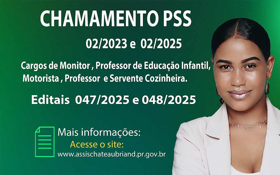O município de Assis Chateaubriand publicou nesta segunda-feira (7) a convocação de candidatos aprovados em Processos Seletivos Simplificados (PSS) para os cargos de Monitor, Professor de Educação Infantil, Motorista, Professor e Servente Cozinheira.