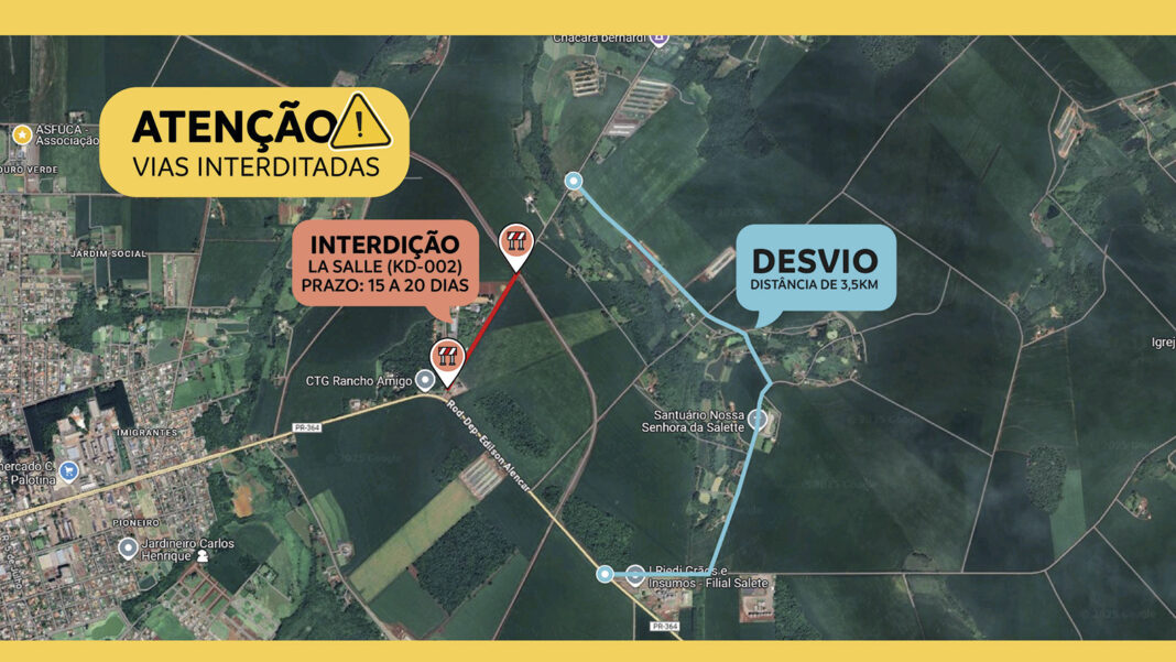O trânsito entre a sede do município e a Linha Alto Pioneiro será desviado para a estrada que passa pelas proximidades do Clube Botafogo e pela unidade de produção de alevinos de tilápia da C.Vale no sentido à PR 364, que liga Palotina a Assis Chateaubriand. A rota alternativa deverá ser usada por um período ainda não determinado.