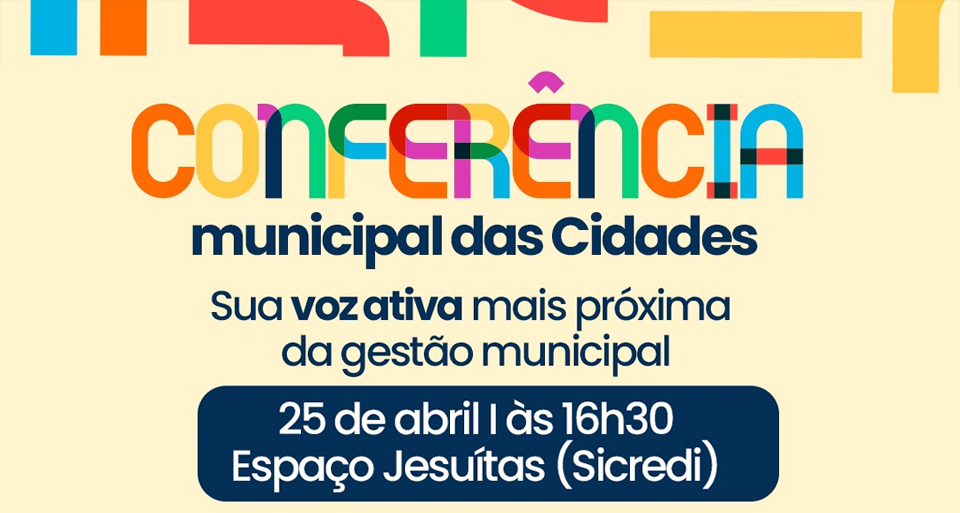 O município de Jesuítas convida toda a comunidade para participar da Conferência Municipal da Cidade, que será realizada no dia 25 de abril, às 16h30, no Espaço Jesuítas, anexo à Sicredi.