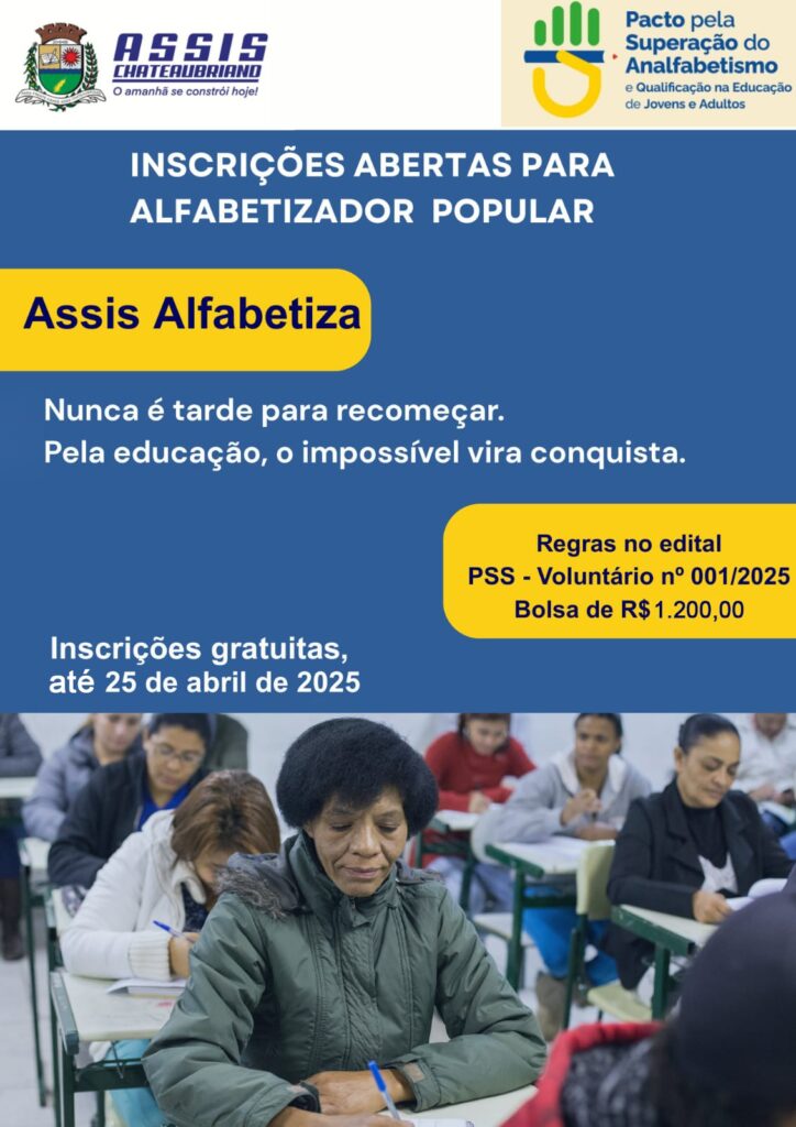 INFOMAÇÕES – Confira o Edital PSS- voluntários nº 001/2025 – Alfabetizadores populares no site da Prefeitura Municipal de Assis Chateaubriand e para mais informações: