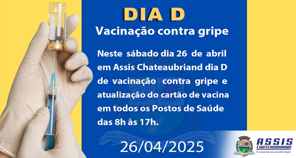 Neste sábado, dia 26 de abril, o município de Assis Chateaubriand, por meio da Secretaria de Saúde, promoverá o Dia D de vacinação contra a gripe. A ação ocorrerá em todas as Unidades de Saúde do município, das 8h às 17h, e também incluirá a atualização do cartão de vacinação. Nas unidades dos distritos e patrimônios haverá intervalo para almoço das 12h às 13h30.