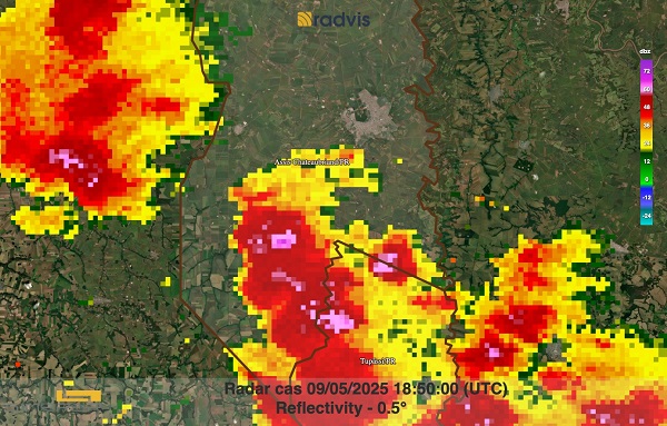 “Estimo que, pela luminosidade e por ainda não ter ocorrido chuva antes, deve ter sido por volta das 15h30 a 15h50, ai o radar observou essa tempestade mais ao sul do ponto de vista do vídeo (área colorida bem no meio da imagem). Era uma tempestade forte, depois disso passou chuva sobre Assis, mas foi outra nuvem de tempestade. A do vídeo se afastou e foi pra Tupãssi”, relatou o meteorologista Marco Jusevicius do SIMEPAR ao Policial Web