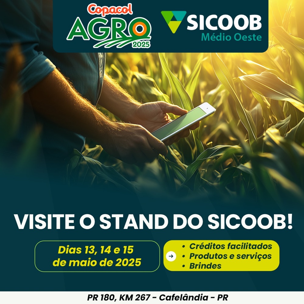 Com forte atuação no agronegócio brasileiro e impulsionador de práticas sustentáveis, o Sicoob marca presença no Copacol Agro 2025. Começou hoje, 13, e segue até quinta-feira, 15 de maio, no CPA em Cafelândia. O evento é uma oportunidade para gerar conhecimento e acessar tecnologia de ponta. No estande do Sicoob, você pode conferir soluções para apoiar e fomentar sua atividade.