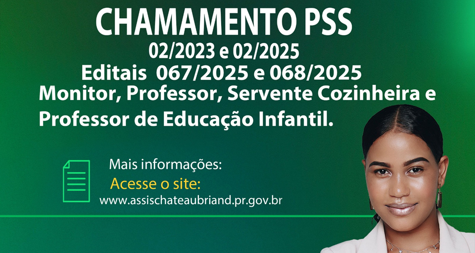 O município de Assis Chateaubriand publicou nesta quinta-feira (15) a convocação de candidatos aprovados em Processos Seletivos Simplificados (PSS) para os cargos de Monitor, Professor, Servente de Cozinheira e Professor de Educação Infantil.