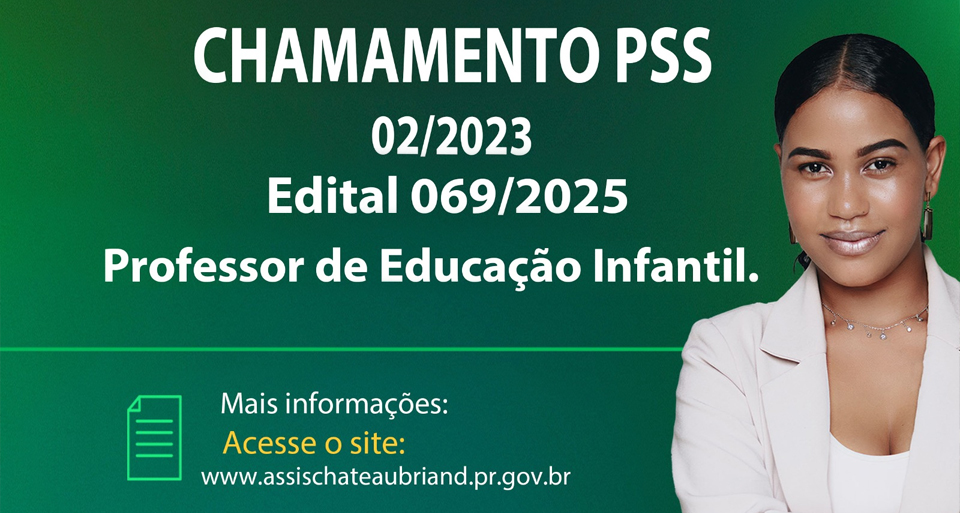 O município de Assis Chateaubriand publicou nesta sexta-feira (16) a convocação de candidatos aprovados em Processos Seletivos Simplificados (PSS) para o cargo de Professor de Educação Infantil. O edital PSS nº 069/2025 publicado no diário oficial, refere-se à 56ª convocação do PSS 02/2023.