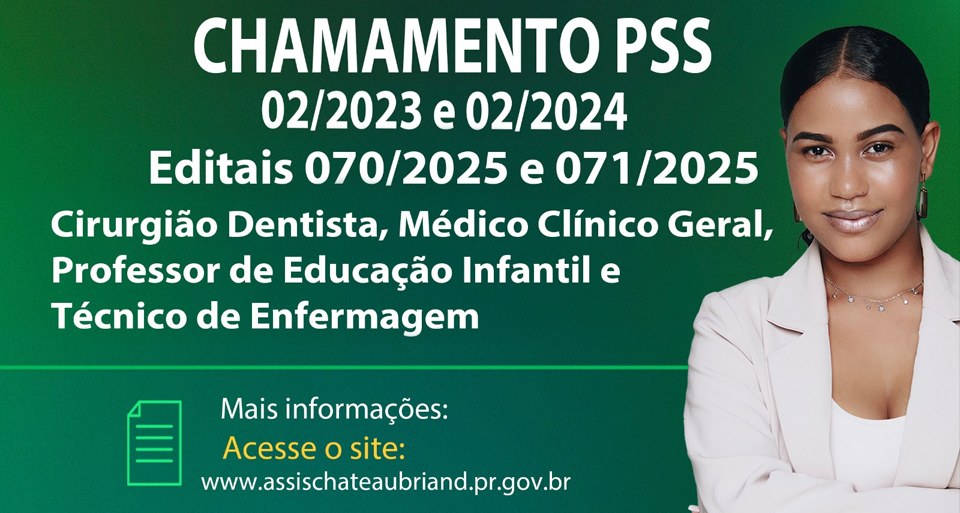 O município de Assis Chateaubriand publicou nesta terça-feira (20) a convocação de candidatos aprovados em Processos Seletivos Simplificados (PSS) para os cargos Cirurgião Dentista, Professor de Educação Infantil, Médico Clinico Geral e Técnico de Enfermagem