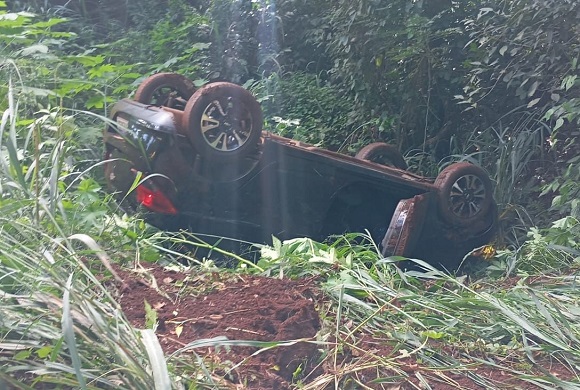 Durante a perseguição, o veículo suspeito perdeu o controle em uma curva e capotou em uma caixa de contenção de água.