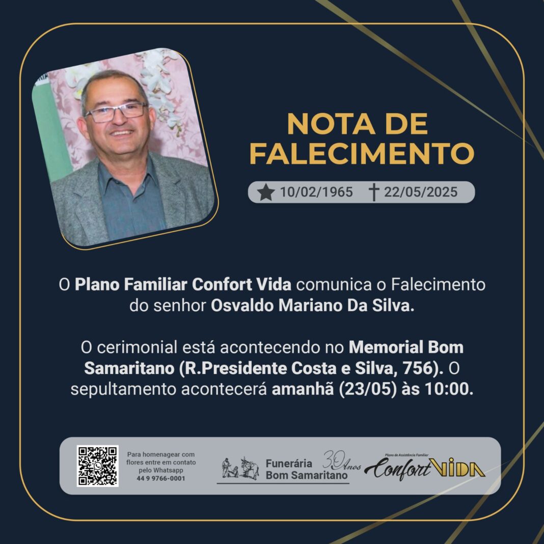 Foi identificado oficialmente no Instituto Medico Legal no final da tarde, o corpo de Osvaldo Mariano da Silva de 60 anos de idade, que morreu no gravíssimo acidente de trânsito, ocorrido por volta das 09h15 de hoje (22), na rodovia PR PR-486, no Km 73+120 metros, trecho Assis Chateaubriand à Brasilândia do Sul, uma colisão frontal que envolveu a Fiat Strada, cor prata, conduzida por um senhor de 78 anos, tendo como passageira, uma senhora de 77 anos, que sofreu ferimentos leves e a motocicleta Yamaha YBR 125, de cor preta, de placa São Miguel do Oeste/SC, conduzida pelo Osvaldo, que era morador do Jardim Progresso, na Rua Santa Catarina.