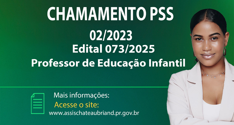 O município de Assis Chateaubriand publicou nesta sexta-feira (23) a convocação de candidatos aprovados em Processos Seletivos Simplificados (PSS) para o cargo de Professor de Educação Infantil. O edital PSS nº 073/2025 publicado no diário oficial, refere-se à 58ª convocação do PSS 02/2023.