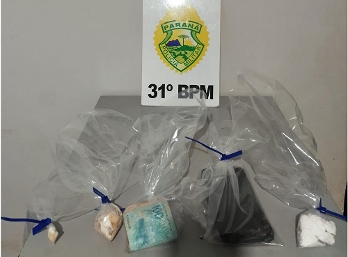 Ao se aproximarem da residência onde o veículo estava estacionado, os policiais identificaram uma mulher que, ao ser abordada, admitiu estar em posse de substância análoga a crack. No mesmo momento, um homem tentou fugir do local e descartou uma sacola, que posteriormente foi localizada contendo drogas. Com ele, também foi apreendida uma quantia em dinheiro trocado, característica comum do tráfico.