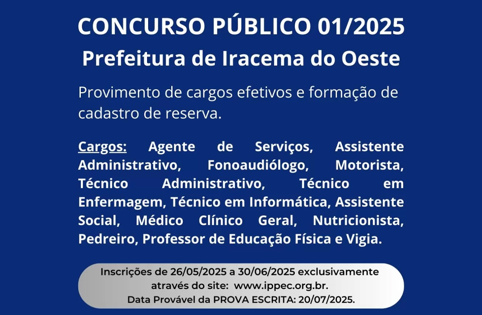 O Edital na íntegra pode ser acessado no Site Oficial do Município, http://iracemadooeste.pr.gov.br/, no ícone Concursos Públicos ou através do site www.ippec.org.br.