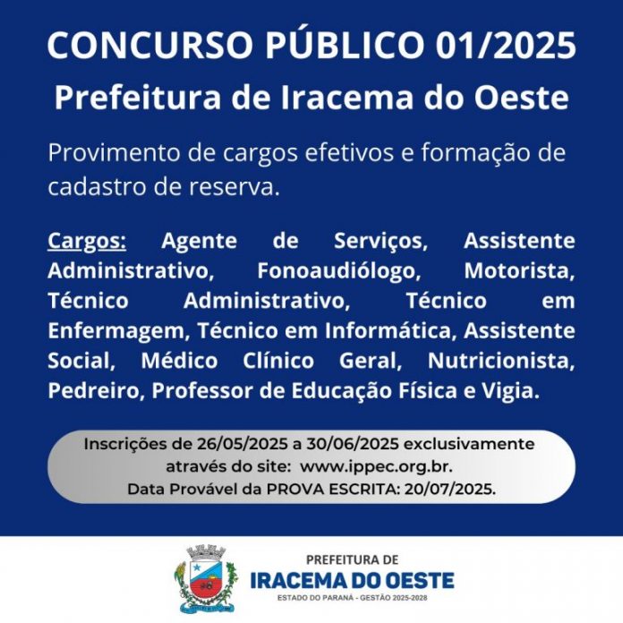 Será admitida a inscrição somente via Internet, no endereço eletrônico www.ippec.org.br, solicitada no período entre 08 horas do dia 26 de maio de 2025 e 23 horas e 59 minutos do dia 30 de junho de 2025, observado o horário oficial de Brasília/DF. A aplicação da Prova Objetiva está prevista para o dia 20 de julho de 2025. O Edital na íntegra pode ser acessado no Site Oficial do Município, http://iracemadooeste.pr.gov.br/, no ícone Concursos Públicos ou através do site www.ippec.org.br.