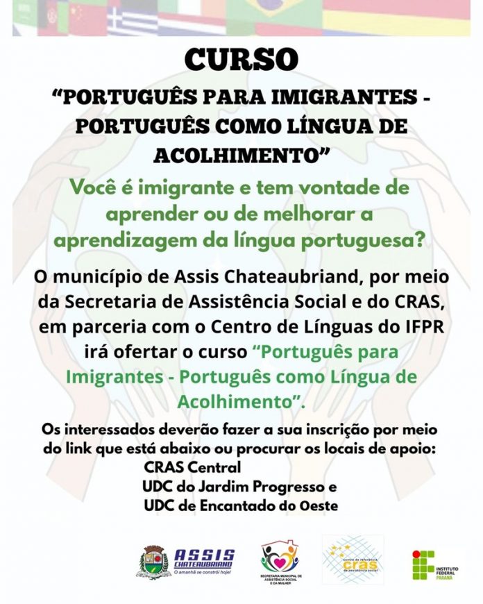 O Municípiode Assis Chateaubriand, por meio da Secretaria de Assistência Social e da Mulher e do CRAS- Centro de Referência de Assistência Social, em parceria com o Centro de Línguas do IFPR, irá ofertar o curso “Português para Imigrantes – Português como Língua de Acolhimento”, curso que tem como título “Português para Imigrantes – Português como Língua de Acolhimento”