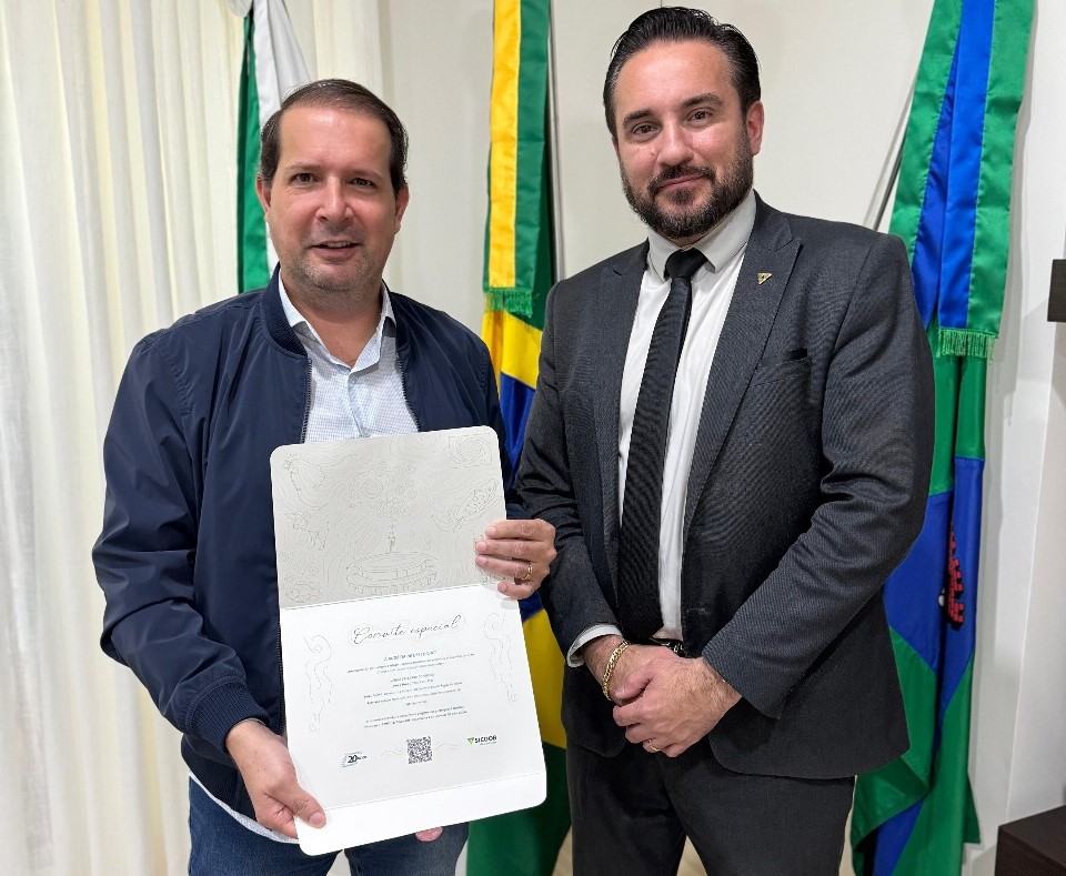 O presidente Rafael Katarinhuk oficializou hoje, 4 de junho, o convite ao prefeito de Assis Chateaubriand e presidente da Associação dos Municípios do Paraná (AMP), *Marcel Micheletto, para prestigiar o evento de celebração dos 20 anos do Sicoob Médio Oeste. Essa é uma grande oportunidade para fortalecer os laços entre a Prefeitura e a Cooperativa, além de reconhecer o importante trabalho desenvolvido pelo Sicoob na região.